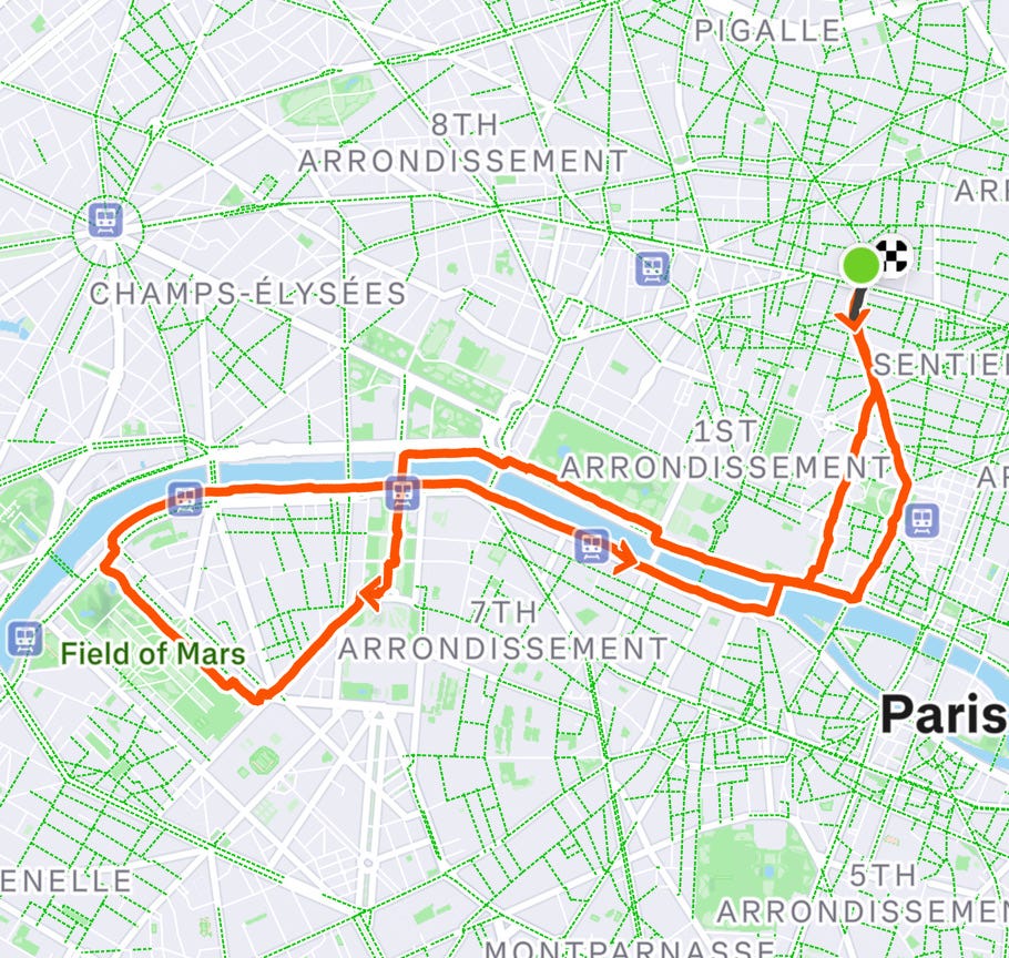 Morning runs turned the city into a conveyor belt of joy: 12–13km along the Seine, cutting past the Eiffel, looping through Champ de Mars and the Tuileries. It’s an active city — you fall in with the chorus — and distance stops feeling like effort when every kilometre delivers a view.